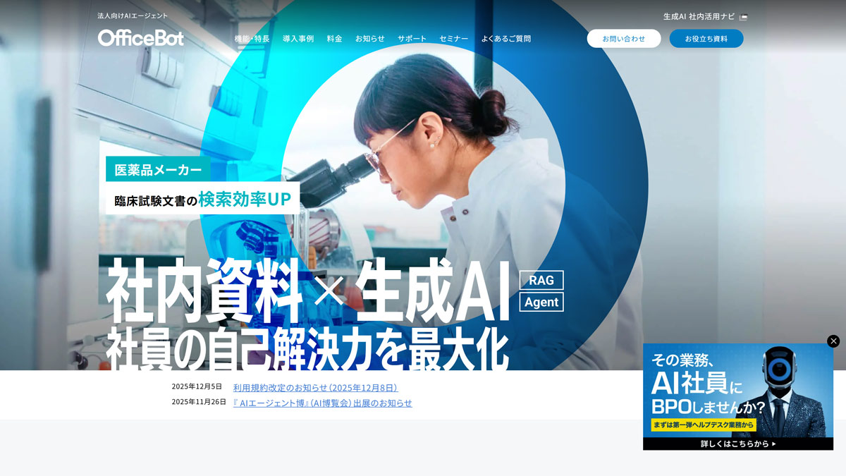 OfficeBot | Microsoft 365との連携に強み、社内FAQ自動化に最適 | 要問い合わせ | Office文書, PDF, Webページ | Microsoft Azureベースの堅牢な基盤 | 導入から運用定着まで専任サポート・定期Web会議支援あり |
