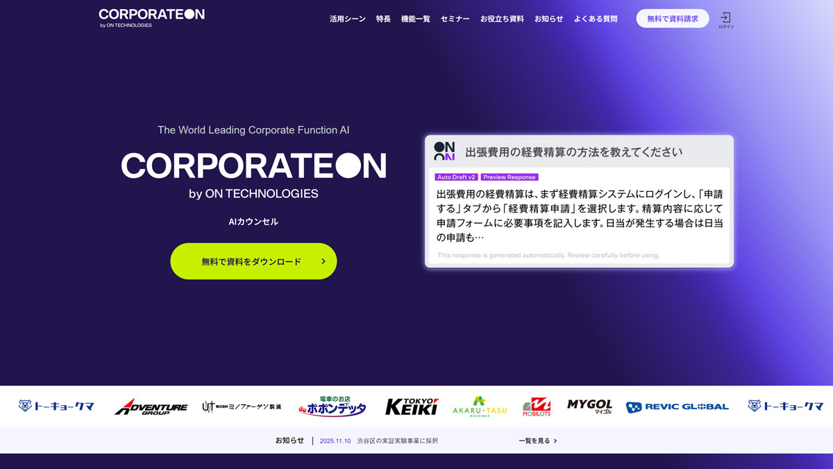 CorporateOnは、株式会社LegalOn Technologiesが提供する法務特化型のAIサービスです。契約書レビュー、法務相談対応、コンプライアンスチェックなど、法務業務の効率化に特化した機能を搭載しています。契約書データベースから類似条項を検索し、過去の取引実績や法務判断を参照できるため、契約書作成やレビュー時間の大幅な短縮が期待できます。