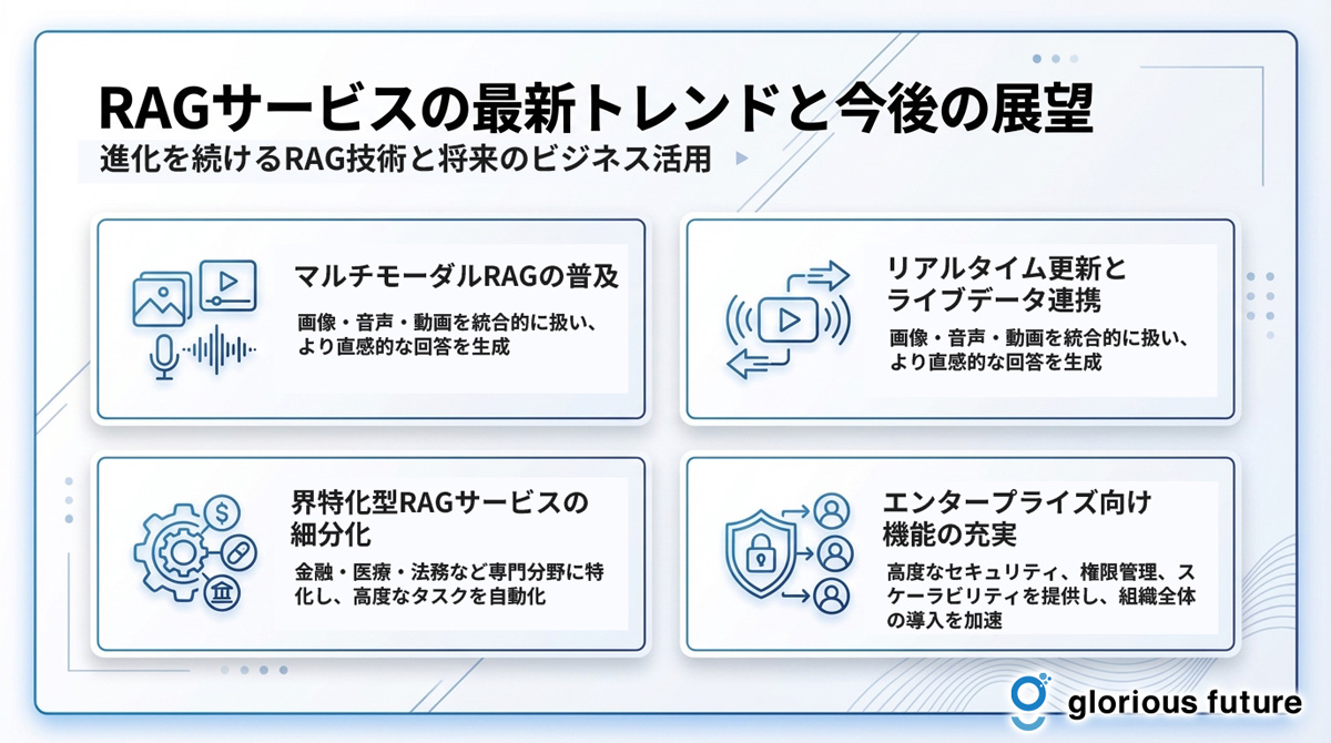 RAG技術は現在も進化を続けており、今後さらに多くのビジネスシーンでの活用が期待されています。ここでは、RAGサービスの将来的なトレンドや技術の進化について解説します。これらの展望を知ることで、長期的な視点でのサービス選定やAI戦略の立案に役立てることができます。