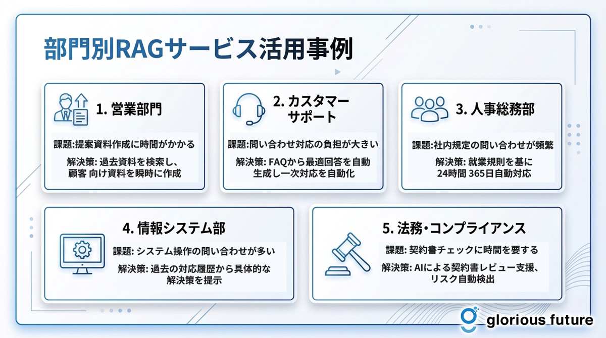 RAG技術は、特定の部門だけでなく、企業内の様々な業務でその真価を発揮します。ここでは、各部門が抱える具体的な課題に対し、RAGサービスがどのように貢献できるかを解説します。自社のどの部門で活用できそうか、具体的なイメージを膨らませてみましょう。