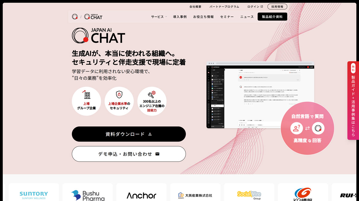 JAPAN AI CHATは、JAPAN AI株式会社が提供するセキュアなChatGPT活用プラットフォームです。汎用性の高いAI機能を、企業が安心して利用できるセキュアな環境で提供しています。閉域網接続やIPアドレス制限などの高度なセキュリティ対策により、機密情報を扱う企業でも安全に利用可能です。テキスト、PDF、URLなど多様なデータ形式に対応し、社内文書やWebサイトの情報を活用した回答生成が可能です。