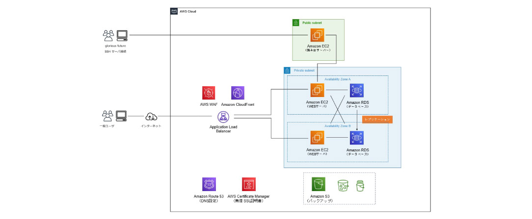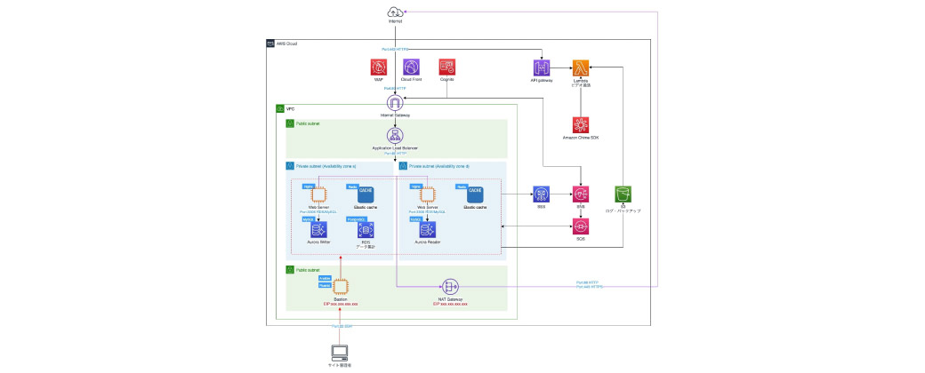 AWS(GCP)環境上にネットワーク設計を行い、アプリケーション要件に必要となるサーバー環境の構築を行います。